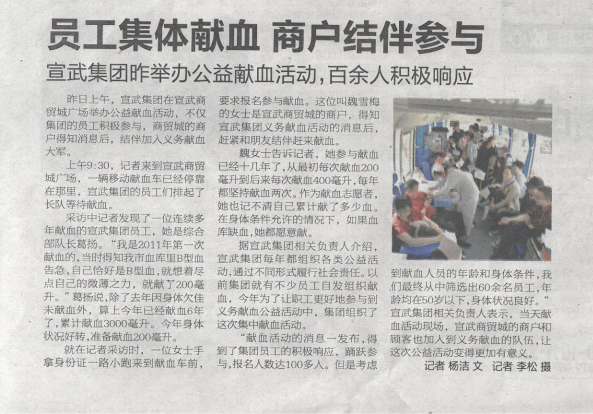 2017年4月22日,《都市晨報(bào)》對宣武集團(tuán)職工無償獻(xiàn)血活動進(jìn)行報(bào)道,彰顯了宣武社會正能量。